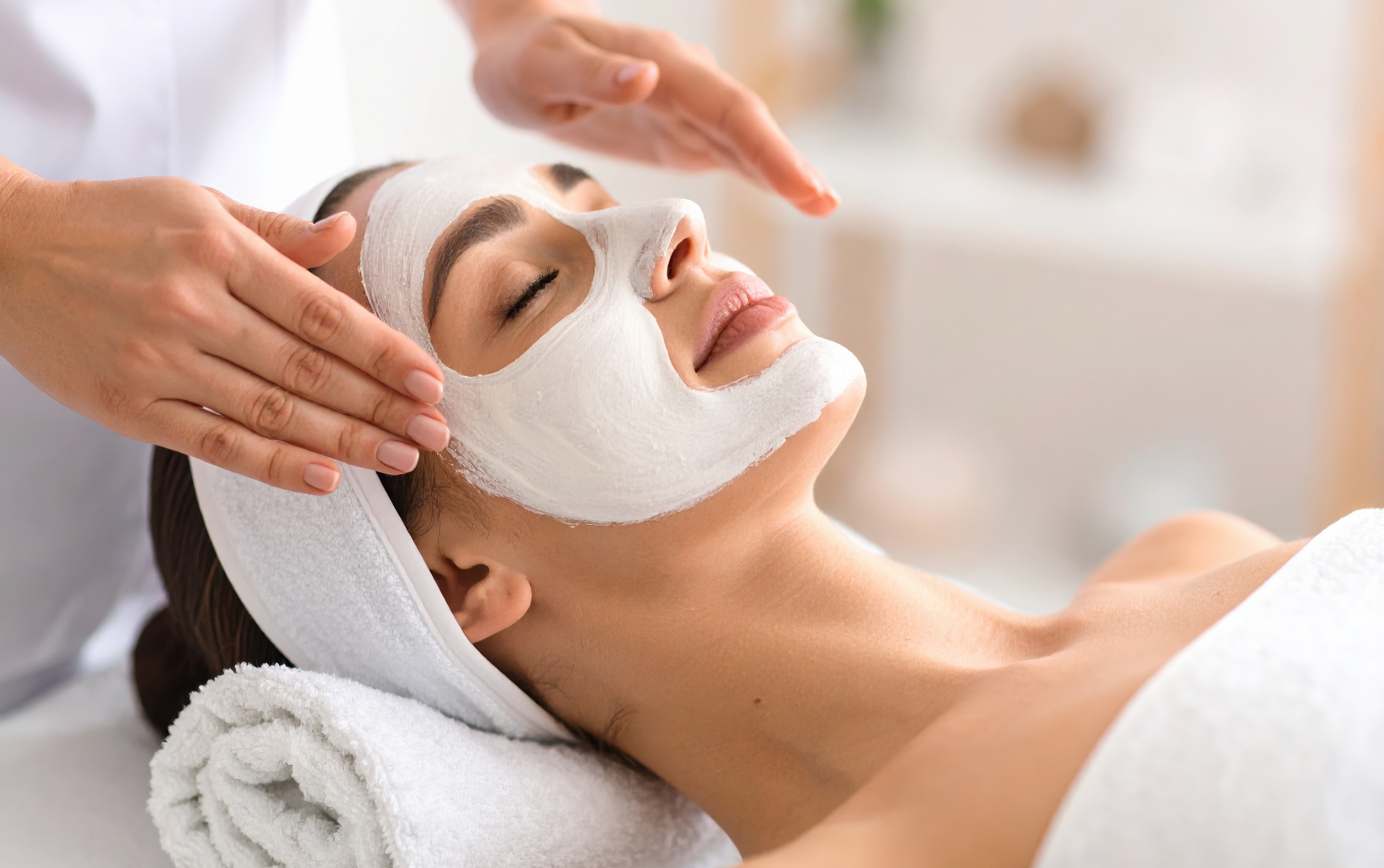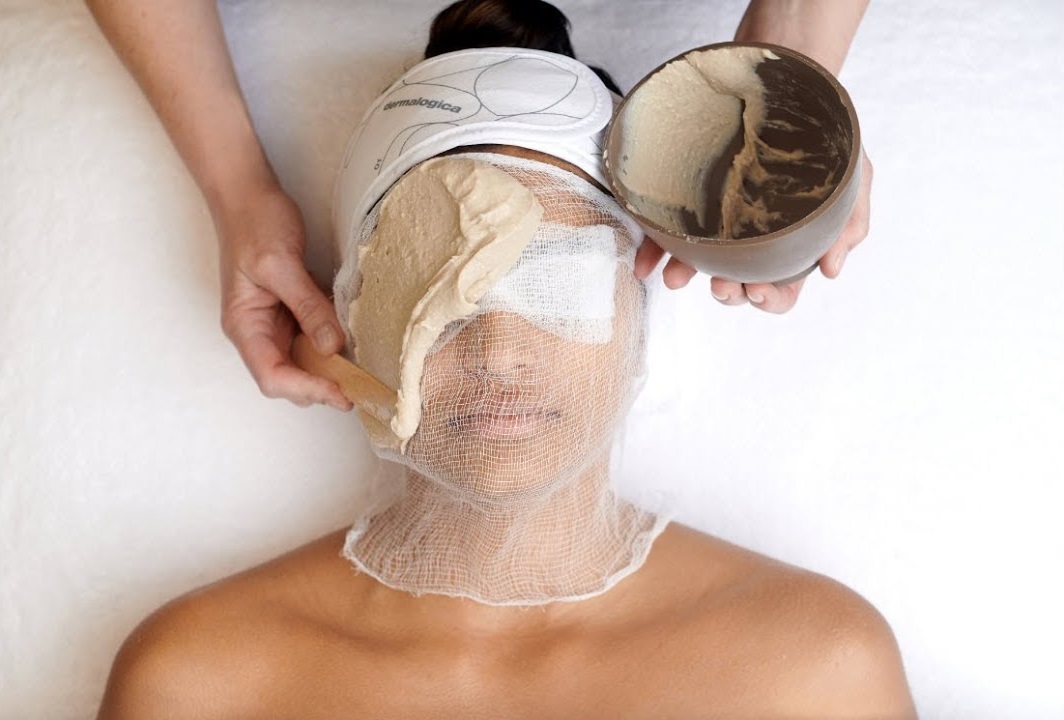 Treatment includes double cleanse, enzyme-based exfoliation, masque, scalp massage, followed by toner, moisturizer, and SPF.